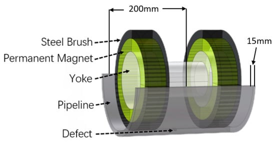 Using magnetic flux leakage (MFL) detection principles, a finite element analysis model was developed for subsea pipeline defect detection, evaluating the MFL pig’s performance, as illustrated in Figure 3. The model includes three components: the excitation device, the defective pipeline under inspection, and the surrounding air domain. The pipeline under inspection has an inner diameter of 200 mm and a wall thickness of 15 mm. The excitation device consists of a steel brush, a permanent magnet, and a yoke, with the permanent magnet acting as the excitation source, using axial magnetization to fully magnetize the pipeline for static magnetic field analysis in MFL detection.