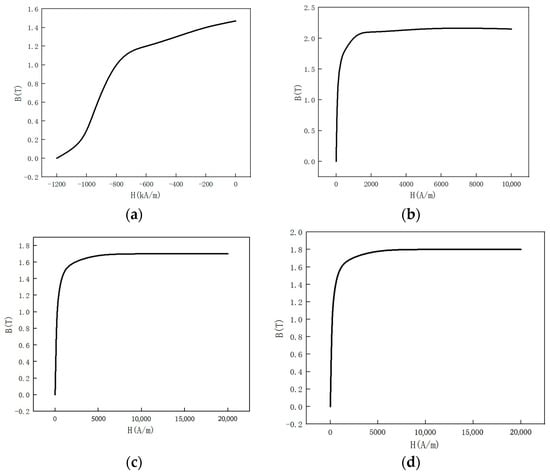 B-H curves of each component: (a) permanent magnet; (b) yoke; (c) steel brush; (d) pipeline.