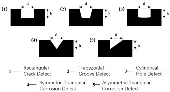 Subsea pipelines, exposed to prolonged corrosion in marine environments, develop surface defects of diverse shapes and sizes, such as cracks, dents, holes, and symmetric or asymmetric corrosion []. To enable finite element simulation, this study simplified the geometry of various defect types, as shown in Figure 10. By systematically varying defect shapes in the simulation model while keeping defect depth, width, and simulation conditions constant, this study analyzed the effects of shape variations on MFL signal distribution characteristics.