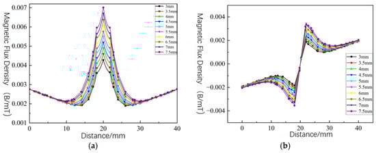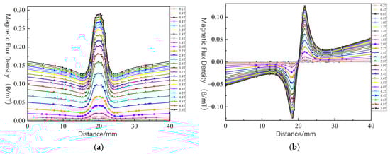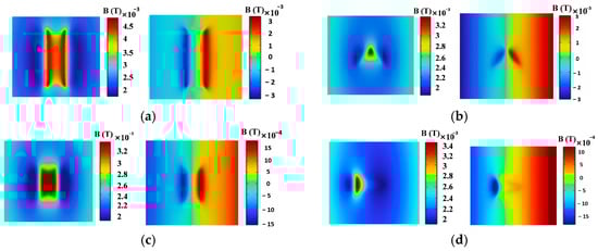 Figure 7 shows the volumetric magnetic flux density distribution cloud map for the simulation model. Analysis indicates that magnetic flux lines are concentrated in the pipeline defect region, with peak magnetic flux density at the defect site. To characterize the leakage field’s magnetic flux density distribution above the defect, this study defined a rectangular region (30 mm × 32 mm) 1 mm above the defect, producing 2D cloud maps of the MFL field’s axial and radial components, as shown in Figure 8. Figure 9 shows that the MFL field’s axial and radial components exhibit symmetric distributions about the defect centerline. The axial component features a dual-peak, dual-valley structure, with peaks at the defect center and valleys at its edges, consistent with axial symmetry, while the radial component has a single peak and valley of equal amplitude, showing central symmetry.