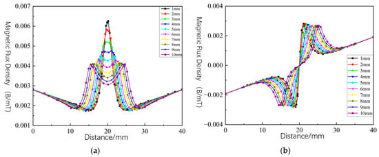 As rectangular defects yield the strongest magnetic flux leakage (MFL) signals and most significant simulation results, this section examines their axial length and radial depth variations’ effects on MFL signals. With defect width constant and depth at one-third of the pipeline wall thickness, axial length was increased from 1 mm to 10 mm in 1 mm increments. Figure 13 shows the axial and radial MFL field component distributions. Analysis reveals that the axial component signal peak decreases with increasing axial length, while waveform width increases. At an axial length of 4 mm, the axial component signal curve shifts from a single-peak to a dual-peak structure. The radial component peak decreases with increasing axial length, while peak-to-peak spacing increases.
