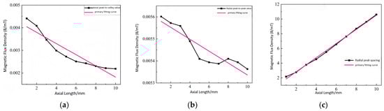 Variation of the three axial characteristic quantities of the leakage magnetic signal: (a) axial peak-to-valley value; (b) radial peak-to-peak value; (c) radial peak-to-peak spacing.