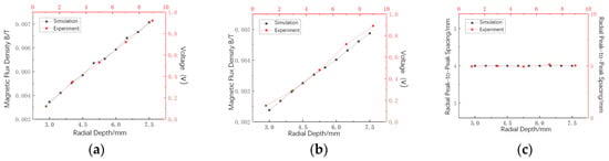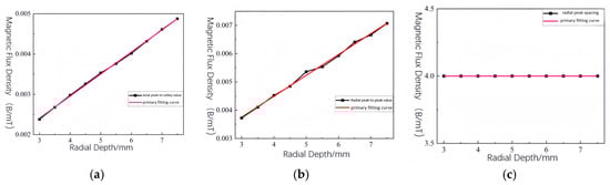 This study examines the effect of varying radial depth from 3 mm to 7.5 mm in 0.5 mm increments on magnetic flux leakage (MFL) signal distribution, using a rectangular defect with a constant 3 mm axial length and fixed width. Figure 15 and Figure 16 show the variation trends of the MFL field’s axial and radial components and three parameters: axial peak-to-valley value, radial peak-to-peak value, and radial peak-to-peak spacing. Analysis indicates that increasing defect depth linearly increases the axial peak-to-valley value and radial peak-to-peak value, while radial peak-to-peak spacing remains unchanged. Fitting results confirm that the axial peak-to-valley value and radial peak-to-peak value are linearly and positively correlated with defect depth. Thus, analyzing the axial peak-to-valley value and radial peak-to-peak value enables accurate defect depth determination, supporting reliable defect quantification.