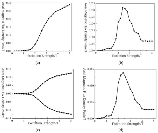 Variation of axial and radial MFL signal peak values with excitation intensity: (a) variation in axial magnetic induction intensity peak value; (b) incremental change in axial magnetic induction intensity peak value; (c) variation in radial magnetic induction intensity peak value; (d) incremental change in radial magnetic induction intensity peak value.