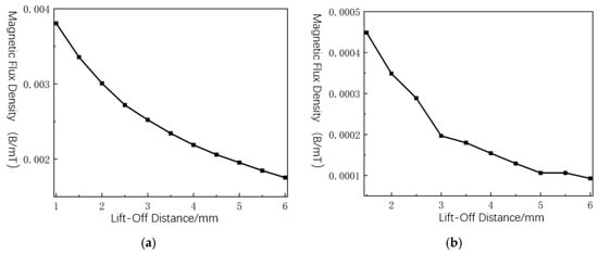 This study defines a 20 mm axial detection path above a pipeline surface defect, incrementally adjusting the path-to-defect distance. To enhance probe durability in practice, a wear-resistant pad prevents direct sensor-to-pipeline contact, and the lift-off value is simulated from 1 mm to 6 mm in 0.5 mm increments to analyze the MFL field’s axial and radial component signals. Figure 19 shows that MFL signal strength significantly attenuates with increasing lift-off value, reducing detection accuracy. At a 6 mm lift-off value, the axial and radial MFL signal curves nearly lose peak and valley characteristics, yielding the lowest detection accuracy. Figure 20 shows the variation trend of the axial MFL signal peak value, with Figure 20b indicating that within the 1–3 mm lift-off range, the signal peak value changes most significantly, reducing detection accuracy due to lift-off fluctuations. In the 3–6 mm lift-off range, the signal peak value change stabilizes, suggesting that a higher lift-off value mitigates fluctuation effects on detection accuracy. Based on this simulation, the magnetic sensor lift-off value should be set between 3 and 5 mm to minimize random vibration interference and maintain detection accuracy.