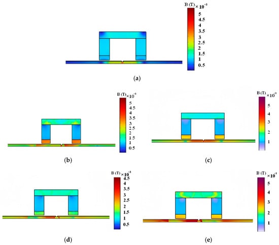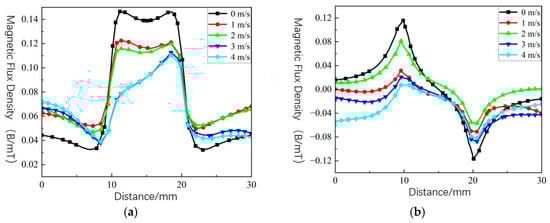 Magnetic field distribution under different inspection speeds: (a) 0 m/s; (b) 1 m/s; (c) 2 m/s; (d) 3 m/s; (e) 4 m/s.