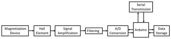 Figure 23 illustrates the framework of the magnetic flux leakage (MFL) detection system. To precisely measure MFL signals at defect locations in subsea pipelines, the system uses a magnetization module to fully magnetize the pipeline, producing a strong MFL field at the defect site. The signal acquisition unit captures the MFL signal and converts it into an electrical signal. The conditioning circuit then amplifies and filters the electrical signal to enhance its quality. The processed electrical signal is transmitted to the Arduino development board’s A/D converter for conversion into a digital signal. The digital signal is then stored and visualized on a PC for data analysis.