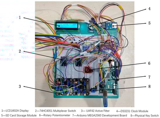 The magnetic flux leakage (MFL) detection system is assembled using a breadboard and DuPont wires, as shown in Figure 33. This multi-channel acquisition system collects axial and radial MFL components, incorporating two signal processing modules. The 74HC4051 multiplexer switch, controlled by Arduino code, selects signals from multiple Hall sensors for filtering and amplification by the UAF42 filter. Pulse signals from the E6B2-CWZ6C rotary encoder are input to the Arduino MEGA 2560 via digital interfaces. The Micro SD card module connects to the Arduino MEGA 2560 via an SPI interface, while the DS3231 clock module provides precise timestamps via an I2C interface. As the system is PC-powered and lacks independent start–stop control, a push-button switch and LCD1602A display are added, connected to the Arduino’s digital input ports. During signal acquisition, the LCD displays “RECORDING”; when stopped, it displays “MAGNETIC FLUX.” To sample 24 Hall sensors within 5 ms, the system is optimized via hardware–software synergy, using non-blocking programming and timer interrupts for independent data collection. Data is temporarily stored in memory and written to the Micro SD card in batches after processing to minimize storage latency.