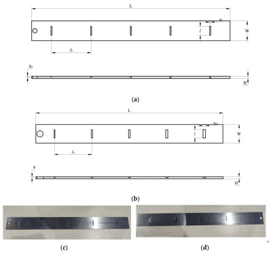 Test Specimens A and B: (a) test plate A with varying defect depths; (b) test plate B with varying defect lengths; (c) flat plate A physical diagram; (d) flat plate B physical diagram.