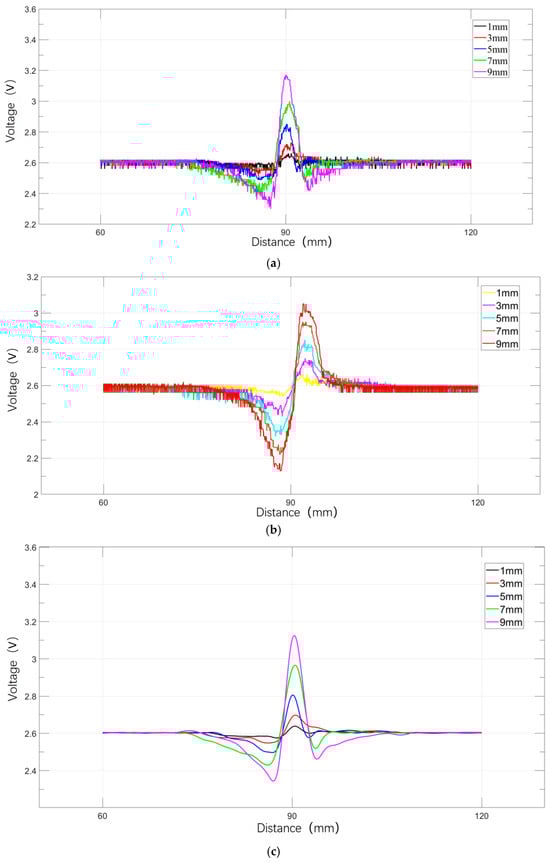 Figure 37 shows the waveform patterns of eight MFL signal channels collected by the MFL detection system, varying with defect depths of 1, 3, 5, 7, and 9 mm. Analysis reveals that MFL signal voltage values from multiple Hall sensors fluctuate around 2.6 V, with axial and radial component waveform changes at defects closely matching simulation results. Further analysis shows that for a given defect, signal voltage values vary across channels, with channels 2 and 3 (axial) and 6 and 7 (radial) typically showing higher peak values than others. This phenomenon is attributed to sensor positioning: sensors directly above the defect center yield maximum voltage amplitude, while those in channels 1, 4, 5, and 8, positioned above defect edges, show lower signal strength. For detailed analysis, waveforms from channels 2 and 6 are extracted and smoothed, as shown in Figure 38. The results indicate that increasing rectangular defect depth raises axial and radial component signal peak values, aligning with simulation-derived patterns.