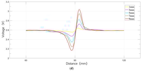 Defect Voltage Signals of Channels 2 and 6 at Different Lift-Off Values: (a) axial component voltage signal; (b) radial component voltage signal; (c) fitted axial voltage signal; (d) fitted radial voltage signal.