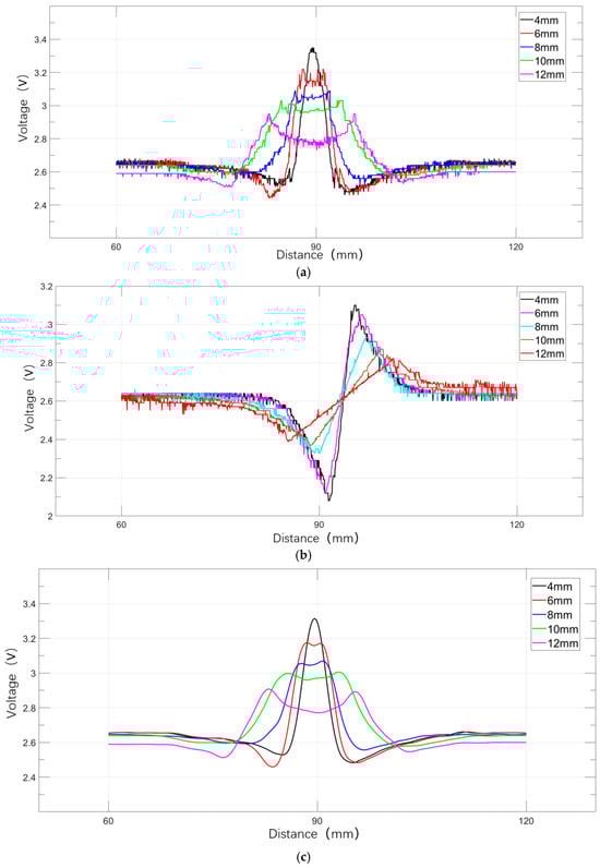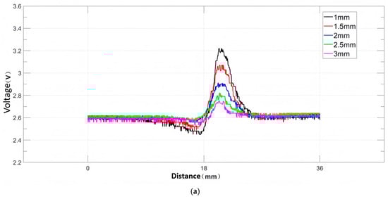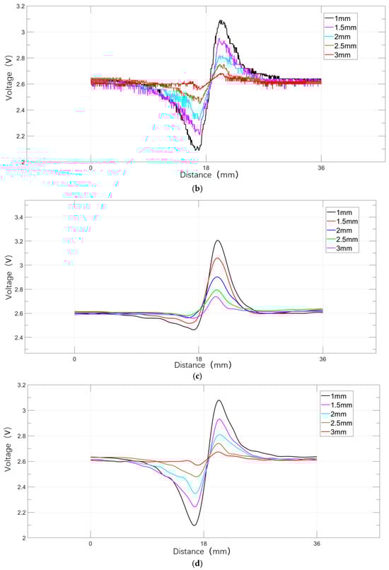 By adjusting the mounting hole position of the detection device’s magnetization module, the lift-off value between the Hall sensors and the defect surface of the iron plate is precisely controlled. When the detector inspects the same defect with lift-off values sequentially adjusted to 1 mm, 1.5 mm, 2 mm, 2.5 mm, and 3 mm, the variations in the signal curves of the axial and radial components of the magnetic leakage field are shown in Figure 41. After smoothing processing, analysis indicates that the lift-off value significantly affects signal strength: higher lift-off values result in lower magnetic leakage field signal strength, while the effective width of the axial and radial component waveforms remains essentially constant. This pattern is highly consistent with simulation analysis results.