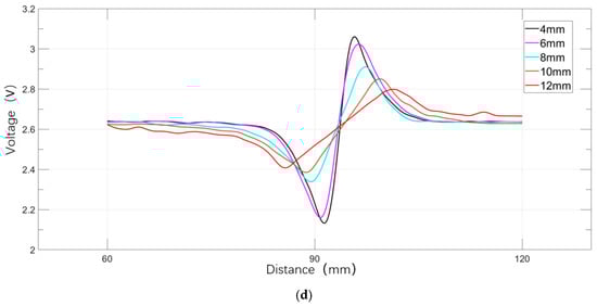 As the magnetic flux leakage (MFL) pig moves uniformly past rectangular defects with axial lengths of 4, 6, 8, 10, and 12 mm, the axial and radial MFL signal components collected by each Hall sensor are shown in Figure 39: (a) axial component voltage signal; (b) radial component voltage signal; (c) fitted axial voltage signal; (d) fitted radial voltage signal. To improve detection accuracy, this study extracts signal curves from channels 2 and 6 to evaluate the effect of varying defect longitudinal length on MFL signals. Figure 40 shows that as defect longitudinal length increases, the axial component voltage signal waveform shifts from a single-peak to a double-peak structure, the waveform width of both axial and radial components increases, and peak values decrease, aligning with simulation results.