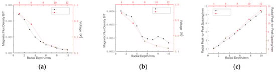 Variation of the three radial characteristic quantities of the leakage magnetic signal: (a) axial peak-to-valley value; (b) radial peak-to-peak value; (c) radial peak-to-peak spacing.