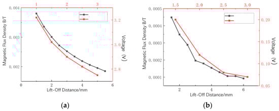 Effect of lift-off changes on the intensity of MFL signals in axial and radial directions: (a) axial component; (b) radial component.