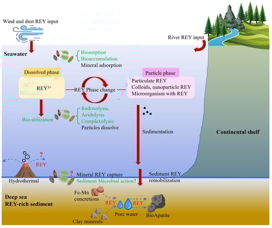 Beyond the traditional terrestrial deposits, REY can enter the marine environment through weathering and erosion of continental materials, windborne dust, and possible hydrothermal activity, ultimately accumulating in deep-sea sediments via complex biogeochemical cycling [3,4,5,6]. With rising demand for REY, the deep sea has recently gained increasing attention as a potential REY resource [4,5]. Understanding the enrichment and circulation processes of marine REY is essential for sustainable development. This review summarizes current knowledge on the occurrence, distribution, and enrichment mechanisms of REY in the marine system, including seawater and deep-sea sediments, with a particular focus on potential microbe–REY interactions. Key findings from recent studies are discussed, alongside unresolved questions requiring further exploration (Figure 1).