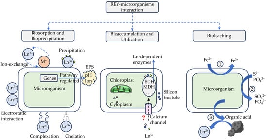 Mechanisms of REY–microorganisms interaction. Biosorption: Diagram shows various REY biosorption mechanisms, including ion-exchange, precipitation, electrostatic interaction, complexation, and chelation. Bioaccumulation and Utilization: different color dots represent REY accumulated in various cellular compartments, EDH and MDH are examples of REY-dependent enzymes. Bioleaching: REY can be mobilized into aqueous phase through ① redoxolysis, ② acidolysis, and ③ complexolysis bioleaching methods to aqueous phase. Abbreviations: Ln—lanthanide; MDH—methanol dehydrogenase; EDH—ethanol dehydrogenase; EPS—extracellular polymers. This figure was made according to references [11,12,13,15,82,83,84,85].