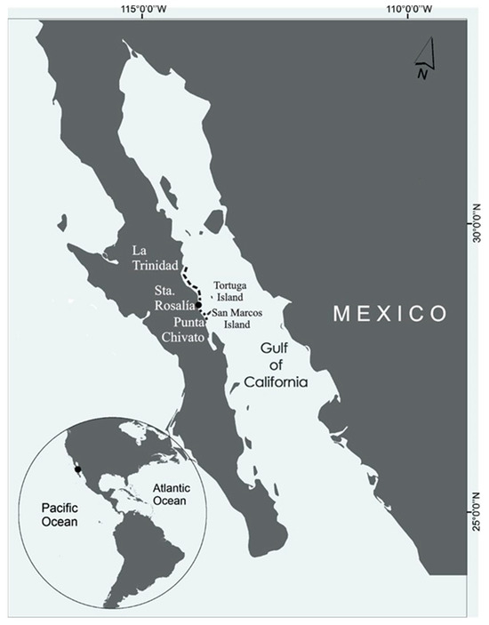 Between December 2019 and January 2020, we were allowed to examine thirty preserved (stuffed) turtle specimens and one carapace kept as decorative items in 31 private fishermen households in Santa Rosalía, Baja California Sur, Mexico. Species identification was conducted following diagnostic characteristics such as the number of prefrontal scales, the number and arrangement of carapace scutes, and head size and shape [20]. Based on these characteristics, we identified 31 hawksbill turtles. According to the owners, the specimens were originally captured by hand during nocturnal spearfishing using Hookah diving equipment between 1980 and 1990, in the vicinity of the fishing harbor of Santa Rosalia, from La Trinidad fishing camp (27°49′23″ N, 112°42′46″ W) to Punta Chivato (27°04′58″ N, 111°57′29″ W), including the islands of Tortuga and San Marcos (Figure 1).