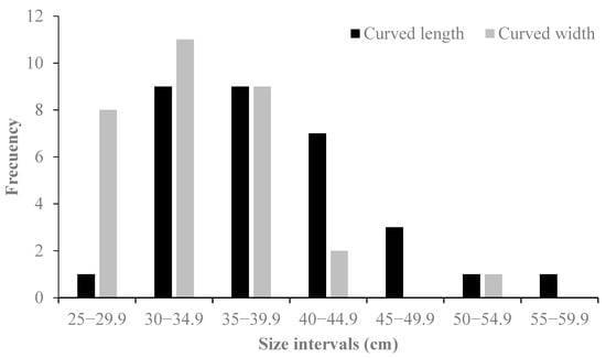 The taxidermied hawksbill specimens exhibited curved carapace length (CCL) measurements ranging from 29.5 to 59.5 cm (mean = 38.75 SD = 6.67 cm) and curved carapace widths (CCW) from 25 to 51.5 cm (mean = 33.67 SD = 5.66 cm; Table 1). Among the six morphometric variables, the straight carapace length (SCL) and plastron length (PL) did not satisfy the normality assumption, while the remaining four variables were normally distributed (α > 0.05, Table 1). Most specimens (87%) displayed a CCL between 30 and 45 cm, with only one specimen showing a CCL < 30 cm and three with a CCL of >45 cm. Similarly, 74% of the CCW measurements ranged between 25 and 44.3 cm (Figure 2), with one specimen having a CCW of >45 cm and seven with values < 30 cm.
