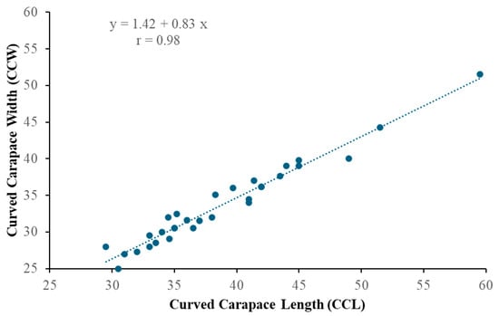 The linear correlations between the four normally distributed variables were all significant (p < 0.01), with correlation coefficients >0.94 (Table 2). The CCL-CCW relationship was nearly perfect within the studied size range (Figure 3), with the CCW increasing by 0.83 cm for each centimeter increase in the CCL. The raw data used in the correlation analyses are provided in Appendix A.