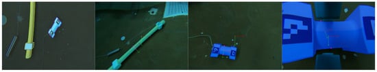 The perception module includes some work in the direction of using neural networks to grasp the pipe segments (method 1). However, to simplify the problem of depth estimation, visual markers (method 2) are used to estimate the pose of the object. Given that the neural network-based approach relies on a monocular camera and only provides object segmentation without estimating its 6D pose, the ArUco marker-based method was selected. Although this method can be susceptible to lighting changes and requires prior knowledge of the object and the marker’s location, it proves to be reliable under controlled conditions. For the purposes of this proof-of-concept experiment (performed in a water tank with clear visibility and controlled illumination) using ArUco markers was an effective and practical solution to validate the research manipulation strategy, simplifying the perception phase. Nevertheless, further research is being conducted to incorporate a stereo camera setup that enables markerless 3D pose estimation and allows the system to operate with objects of varying geometries and under different lighting conditions, moving toward more robust and generalizable underwater assembly tasks. In this section, both approaching methods are presented, with method 2 being chosen for the experiment.