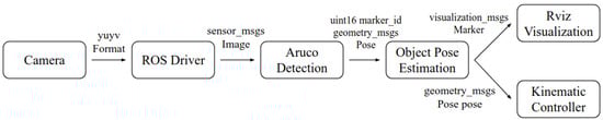 First, the ROS driver used the YUYV image stream from the cameras and published it to the sensor_msgs/Image topic. Then, ArUco markers were detected using the previously mentioned package. Once detected, the marker poses were published to a ROS topic and subsequently read by the object pose estimation node. This node estimated the object’s position and orientation either by averaging the poses of multiple ArUcos or by applying a fixed offset, depending on whether one or two markers were detected. Once the object’s pose relative to the camera frame was obtained, it was transformed into the world NED frame using ROS’s tf system. The resulting global pose was then published for use by the task-priority kinematic controller. Additionally, a visualization marker containing the pose and the mesh of the coupler and the pipe was published to ROS and displayed in Rviz. A diagram of the perception module is shown in Figure 2.