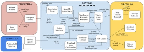 Diagram of the system architecture. Four modules are presented in this diagram: perception, BlueROV I-AUV, Girona500 I-AUV, and control architecture. The standard ROS messages and services link the different modules and submodules and are represented with arrows.