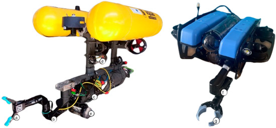 On the left the G500 I-AUV. (a) Two-fingered end-effector with camera, (b) Reach Bravo 7 manipulator, (c) Payload enclosure, (d) Low-Light HD USB camera enclosure, (e) Jetson Orin and stereo camera enclosure. On the right, the BlueROV I-AUV. (f) Reach Alpha 5 manipulator, (g) Custom end-effector for pipe grasping.