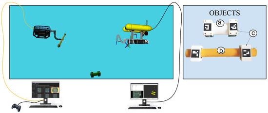 The perception module used in the experiment was built upon a calibrated camera setup capable of detecting ArUco markers [33] and estimating their poses relative to the camera frame. The pose information was then published to ROS using the aruco_opencv package [34]. This real-time feedback allows for computing the world’s NED position and orientation of the target objects, which was crucial for executing reliable grasping and assembly actions. The use of ArUco markers provided a lightweight but effective solution for underwater perception, ensuring the repeatability and precision required for intervention tasks.