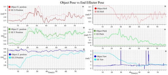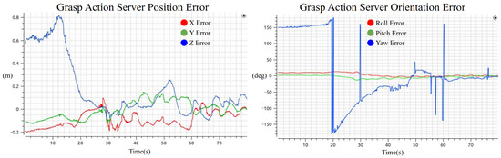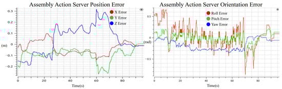 The data presented in Table 3 correspond to the evaluation of pose error during both experiments: grasping and assembly. For the grasping task, the analysis was performed from second 50 to second 78 of the execution, which corresponds to the time window after the end-effector had reached the first approach pose and started moving gradually toward the final grasp target. For the assembly task, the entire 96-second duration of the action server’s activity was used, since the end-effector was already aligned with an approach pose at the beginning of the task.