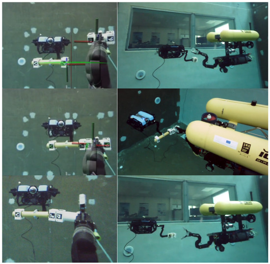 Figure 14 shows a sequence of images from the assembly process at different moments. The left side of the figure displays the view from the frontal camera integrated into the Girona 500 I-AUV for this experiment, while the images on the right provide an external view captured by a second BlueROV, used just for recording purposes. The top pair of images represents the moment when the assembly action server was triggered. The middle pair captures the exact instant when the assembly was executed. Finally, the bottom pair shows the Girona 500 I-AUV opening the gripper and retreating from the BlueROV I-AUV, which is holding the assembled pipeline.
