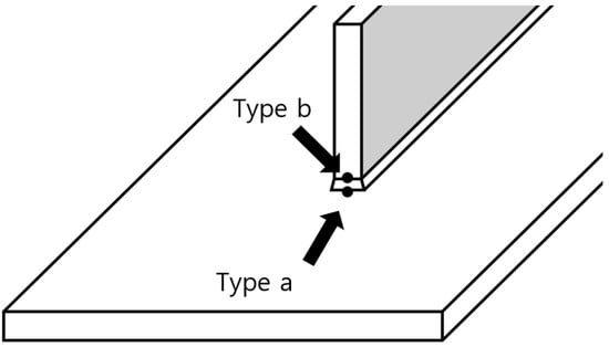 The International Institute of Welding (IIW) provides guidelines for hot spot stress approach []. This method has been widely adopted by major classification societies for evaluating welded joints, particularly to assess local stresses at weld toes. This method estimates stresses at the structural discontinuity by extrapolating surface stress values measured at certain distances from the weld toe. There are a few different stress extrapolation techniques used as commonly recommended procedure for calculating hot spot stresses in welded structures. Figure 1 illustrates the schematic diagram of hot spot stress. Hot spot stress is categorized into two types—Type (a) and Type (b), as shown in Figure 2 []. Type (a) hot spot refers to weld toes on the surface of a plate, while Type (b) hot spots refer to those located at the plate edge. Hot spot stresses are calculated using either Equations (1) or (2) [].