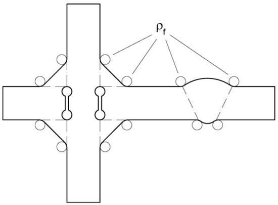In Equation (3), denotes the actual notch radius, s is a factor for stress multiaxiality and strength criterion, and represents a substitute micro-structural length. According to the IIW Recommendations, s is set to 2.5 and to 0.4 mm, while is assumed to be 0 mm to obtain conservative results, resulting in a final fictitious notch radius of 1 mm [].
