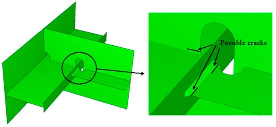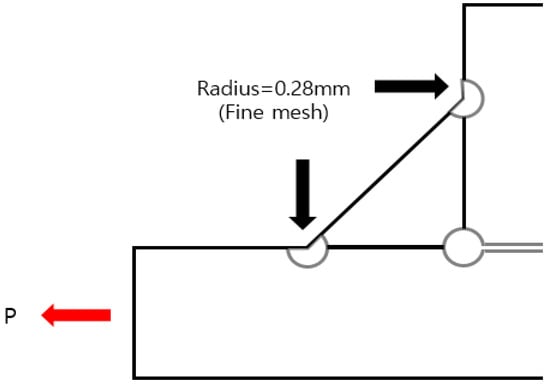 The effective notch stress approach evaluates fatigue life based on stresses obtained from finite element analysis by introducing a fictitious notch a potential fatigue failure location. A schematic illustration of the effective notch stress approach is shown in Figure 3. For the fictitious notch, the following Equation (3) is proposed [].
