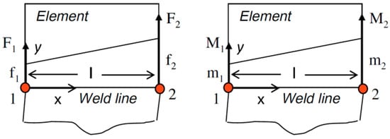 To develop a fatigue strength assessment method that is insensitive to the mesh size used in finite element analysis, Dong proposed the structural stress approach []. Once the nodal forces () in the y direction and nodal moments () with respect to the axis are obtained as shown in Figure 5, the corresponding line forces () and line moments () can be calculated using Equations (6) and (7).