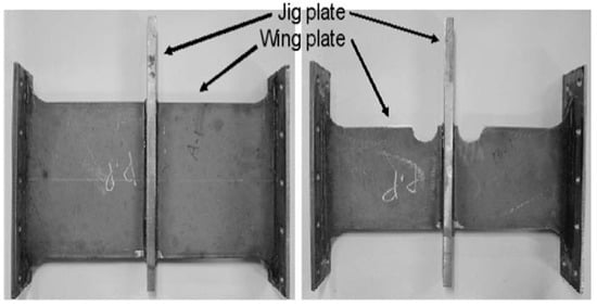 The experiment was conducted by fixing the symmetric specimen from both sides and applying a cyclic load to the central flat plate. Figure 8 shows the actual test specimen. The flat plate to which the load is directly applied is referred to as a jig plate, and the plates on both sides are referred to as wing plates.