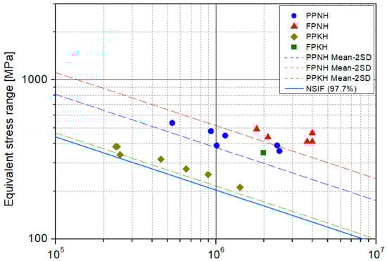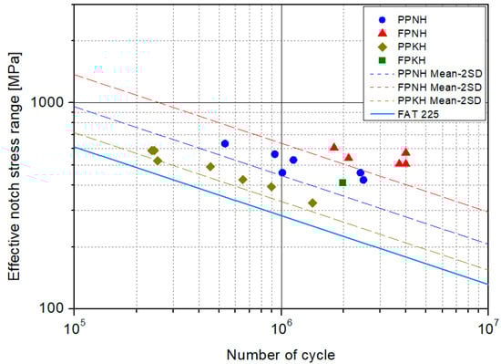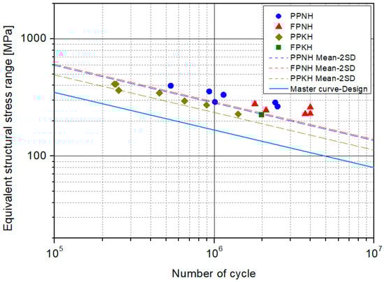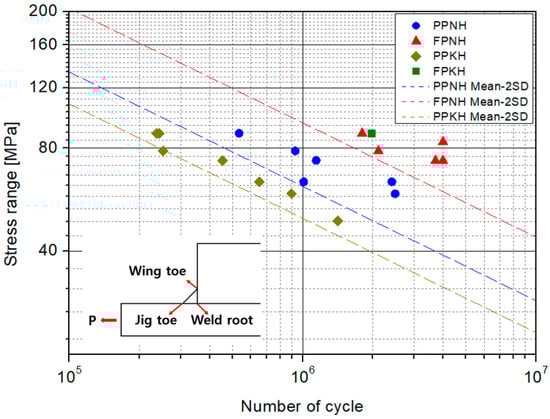 Kim et al. used a shell model to analyze the structural stresses at predicted failure locations for each case. In this study, the stress concentration factor is determined based on the structural stresses and nominal stresses obtained from a previous study, and it is used to calculate the structural stress and equivalent structural stress corresponding to the applied load. Figure 20 presents the S–N curve showing the equivalent structural stress and the experimental results.