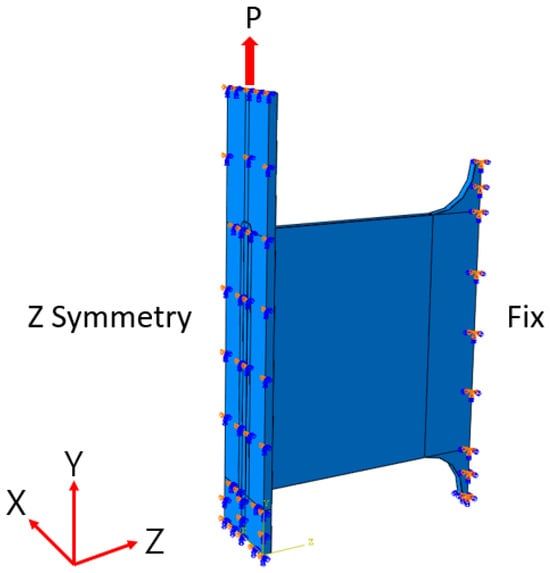 A commercial software, ABAQUS 6.12, was used to generate the finite element models, and finite element analysis was performed to apply each local stress approach. The finite element constituting the model is 8-node 3D stress elements with reduced integration (C3D8R). This element type is commonly used for three-dimensional finite element analysis. It provides a balance between computational efficiency and accuracy for three-dimensional solid mechanic problems. To ensure consistency with the experimental setup, the FE model was developed based on the geometry and conditions used in the fatigue tests. The boundary conditions were applied identically to all models, as shown in Figure 10, and symmetry conditions were employed to reduce the computational cost.