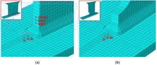 For the hot spot stress approach, the model shown in Figure 11 was used. Since the jig toe corresponds to a Type (a) hot spot, the hot spot stress was calculated using the nodal stresses at distances of 0.4 t and 1 t. In contrast, the wing toe corresponds to a Type (b) hot spot. Therefore, the stresses at nodes located 4 mm, 8 mm, and 12 mm away were used for the hots pot stress evaluation. The element size near the hot spot region followed the IIW Recommendations, corresponding to for Type (a) hot spot and for Type (b) hot spot.