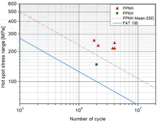 IIW Recommendation provides reference FAT curves depending on the geometry of the structures for hot spot stress approach. For the longi-web connection in this study, FAT 100 curve is used. The hot spot stress and the corresponding experimental results are shown in Figure 12. Since the hot spot stress approach evaluates fatigue strength based on surface stresses, it is not suitable for assessing the fatigue performance at the weld root. Therefore, the evaluation is limited to the weld toe region. As the FPNH and FPKH results lie above the FAT 100 curve, it can be concluded that the experimental results indicate a longer fatigue life compared to those predicted by the hot spot stress approach.