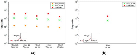 Figure 13 compares the predicted fatigue life based on the hot spot stress approach for FPNH and FPKH with the experimental results. The x-axis indicates the applied load conditions and the fracture location from the fatigue tests, while the y-axis represents the fatigue life. The number in parentheses denotes the test number under each load condition. In the case of FPNH, the fatigue life of the wing toe is the lowest, which corresponds to the location where failure predominantly occurred during the fatigue tests. Similarly, at the jig toe in FPKH, the predicted fatigue life is less than the experimental result.