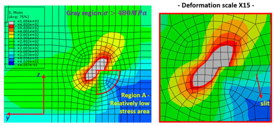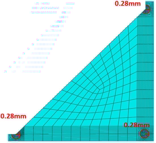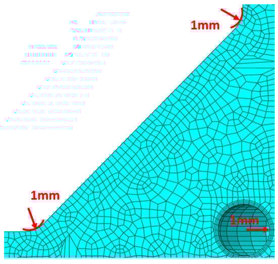In Equation (4), W is the strain energy density, K1 and K2 are the mode I and mode II stress intensity factors, e1 and e2 are parameters depending on the notch opening angle, E is the elastic modulus, λ1 and λ2 are eigenvalues for each mode, and R0 is the radius. As shown in Figure 4, a refined mesh is generated within a radius of 0.28 mm to calculate the mean strain energy density over the evaluation area.