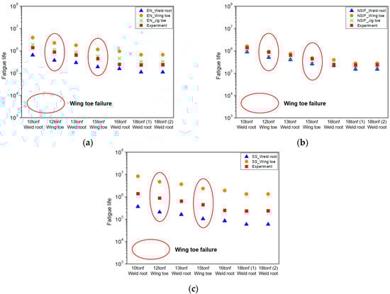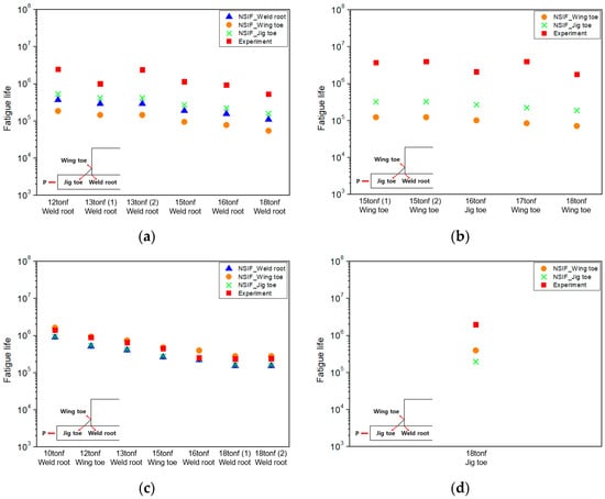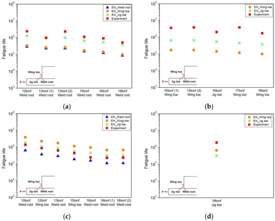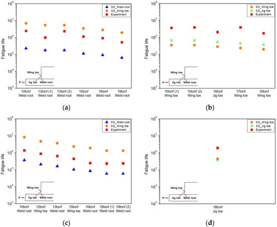 In all conditions, the analysis results lie above the design S–N curve. In addition, compared to other local stress approaches, the structural stress method showed the most linear S–N data trend regardless of the structural geometry or weld penetration. Figure 21 presents the predicted fatigue life at each location based on the structural stress approach. It can be observed that the predicted failure locations correspond to the primary failure locations observed in the experiments.