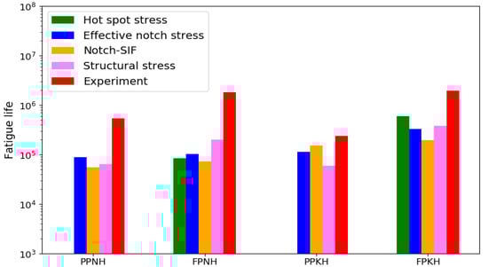 The degree of conservatism in fatigue life prediction varied across the cases. For example, in the notch stress intensity factor method, the PPNH, FPNH, and FPKH models yielded the most conservative results, whereas the PPKH model predicted the longest fatigue life. In the structural stress approach, the PPKH model showed the lowest fatigue life, while the FPNH model resulted in the most non-conservative evaluation.