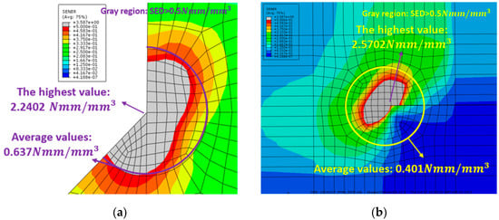 Strain energy density results under a load of 18 tonf: (a) wing toe; (b) weld root.