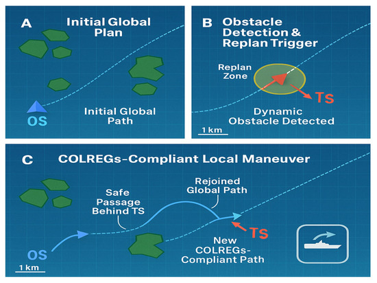 Autonomous maritime navigation is fundamentally a multi-scale decision-making problem, requiring both long-term strategic planning and short-term tactical maneuvering. Consequently, hybrid architectures that decouple these two tasks have become a prominent research direction. At the global planning level, graph-search algorithms, particularly A* and D* variants, are widely employed due to their efficiency and completeness guarantees. The D* Lite algorithm, in particular, is well-suited for dynamic environments, as it can incrementally update paths in response to newly discovered obstacles without requiring a full replan, thus saving significant computational resources [7]. Recent efforts have sought to enhance D* by incorporating adaptive weighting for heuristics to balance speed and optimality or by integrating potential field methods for smoother local obstacle avoidance [8]. However, these classical planners often operate on a simplified world model and struggle to handle complex, unmodeled interactions with multiple dynamic agents. This limitation necessitates a more sophisticated local control module.