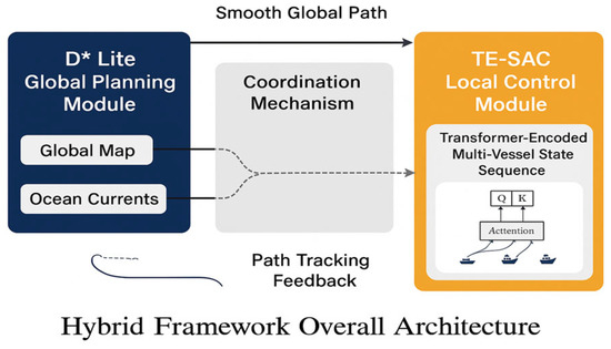Our proposed framework, D* Lite + Transformer-Enhanced Soft Actor-Critic (TE-SAC), adopts a hierarchical architecture to address the complexities of autonomous maritime navigation, as illustrated in Figure 2. This architecture decouples the problem into two main layers: global path planning and local motion control, which are coordinated to ensure both long-term efficiency and short-term safety.