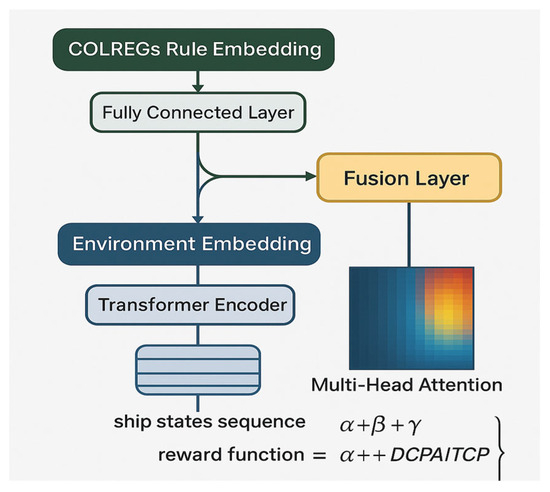 Based on the content and structure of the first image, its color design reflects the hierarchical logic of the model architecture: The COLREGs Rule Embedding layer on the left (typically represented in cool tones like blue) symbolizes the digitized input of international maritime collision avoidance rules; the Environment Embedding layer (often using green or earth tones) corresponds to the feature extraction of the dynamic navigation environment; the central Fully Connected Layer (commonly depicted in light gray or neutral transitional colors) serves as the basic information fusion module; while the Transformer Encoder on the right (often highlighted in warm colors like orange) emphasizes its core capability in processing sequential multi-vessel states. The state sequence at the bottom (α+β+γα+β+γ) and the reward function (α+DCPA/TCPAα+DCPA/TCPA) are highlighted in eye-catching yellow or red, underscoring these key output metrics. This color scheme intuitively distinguishes the four functional modules—rule constraints, environmental perception, neural network operations, and objective functions—through contrasting color blocks, enhancing the visual representation of the model’s dual-branch information processing flow.