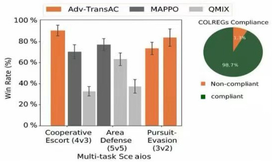 Superior Performance, Robustness, and Compliance: Extensive simulations confirm the framework’s state-of-the-art capabilities, including a 92% mission success rate, an exceptional 98.7% compliance with COLREGs, and an 8% performance degradation against unseen adversaries, outperforming existing methods while meeting real-time processing and energy efficiency requirements.