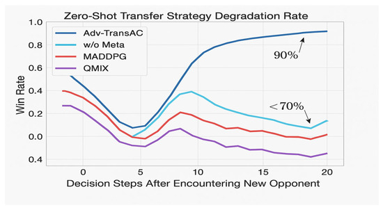 To What Extent: The effectiveness of this approach is starkly illustrated in the zero-shot transfer experiment (Figure 7). While traditional MARL baselines saw their performance plummet by up to 45% against unseen opponents, our complete framework (Adv-TransAC) suffered only an 8% performance degradation. Critically, an ablation variant of our model without the meta-learning component (w/o Meta) performed nearly as poorly as the baselines, proving that this mechanism is directly responsible for the observed robustness and generalization.